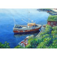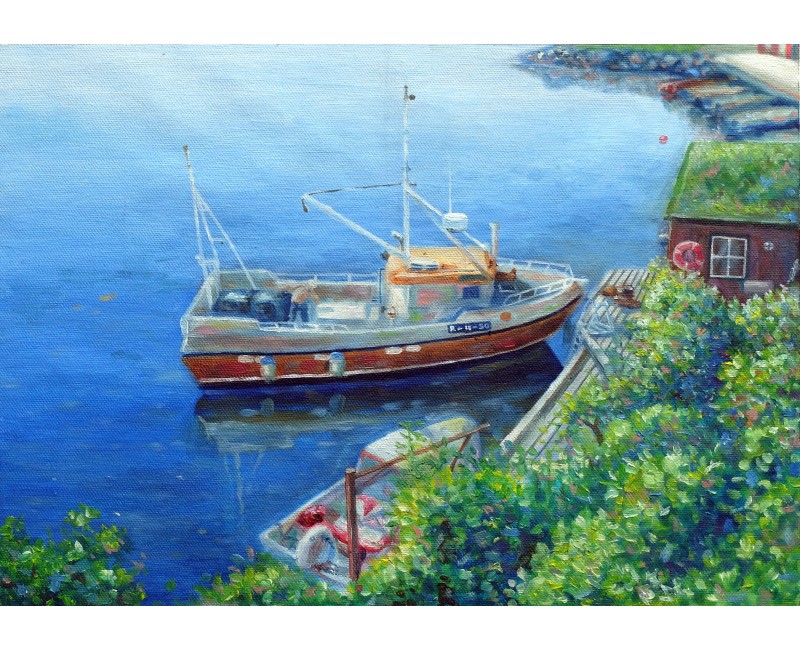 Tags: oljemaleri, nøytral bakgrunn, landskap, utendørs, båter, natur, tre, vann, sjø